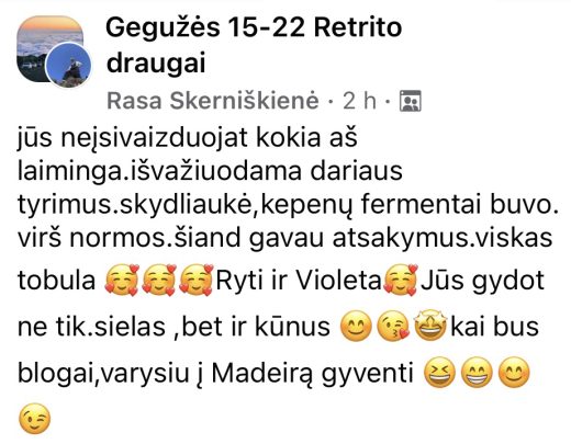 “…Sustiprini savo kūną aktyviu fiziniu krūviu, kasdien keliaudamas po beprotiško grožio gamtą, kurią patiri ne per autobuso langą, o visu kūnu, išsivalai organizmą, kasdien valgydamas aukštų vibracijų maistą – tobulus vaisius, daržoves, riešutus, apsisiauti fantastiškos mūsų dalyvių grupės ir organizatorių bendryste…” – Retrito dalyvė