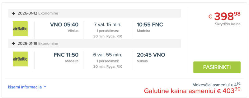 Žiemą tiesioginių skrydžių iš Vilniaus nėra. Šiems retritams atitinka patys patogiausi skrydžiai: Vilnius – Funchal per Skrendu.lt arba Airbaltic.com, bilietai apie 400-500 eur į abi puses: